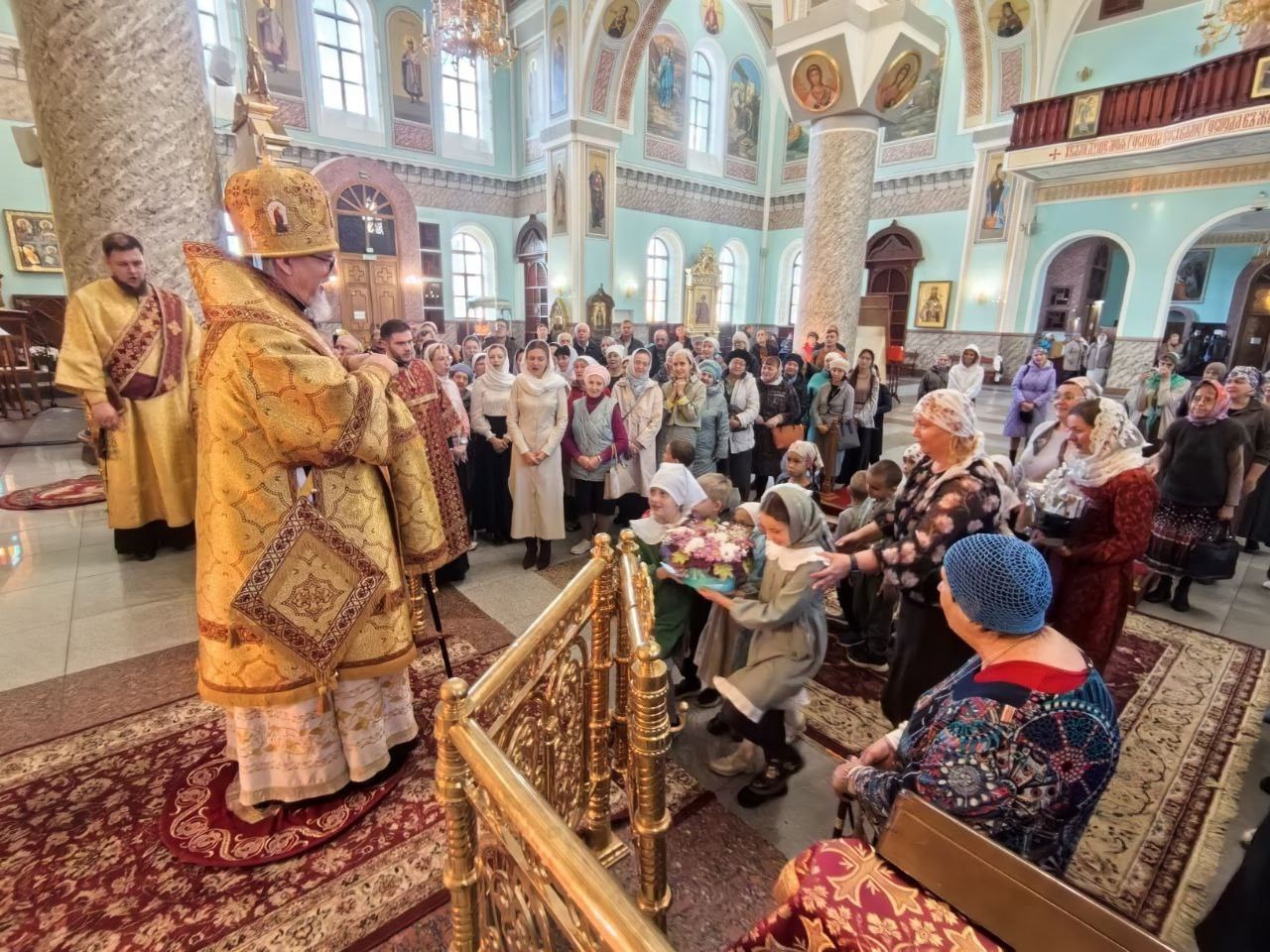 Также, в свою очередь дети воскресной школы при кафедральном соборе Казанской иконы Божией Матери и сослужащее духовенство поздравили владыку митрополита, пожелав ему Божией помощи в архипастырском служении на многая и благая лета.