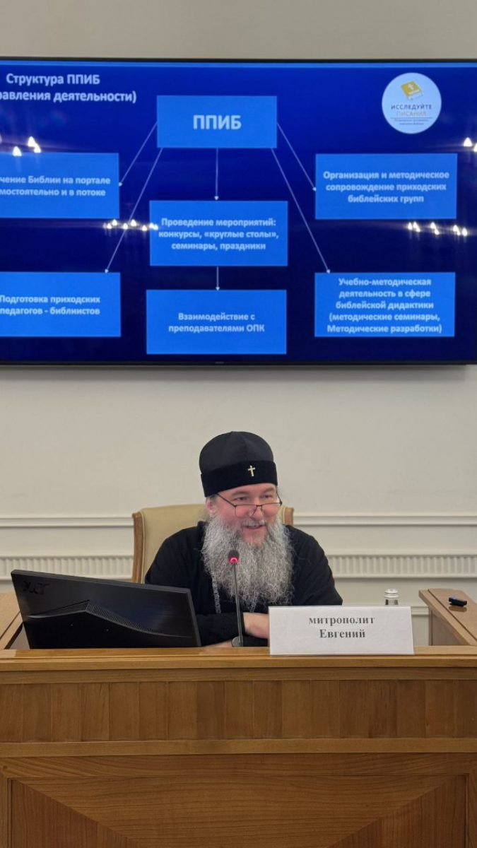В завершении курсов была встреча с председателем Синодального отдела религиозного образования и катехизации, митрополитом Екатеринбургским и Верхотурским Евгением. Владыка Евгений выступил с докладом, в котором подчеркнул стратегическое значение Патриаршей программы изучения Библии как одного из ключевых направлений работы СОРОиК. Он подробно остановился на основных направлениях деятельности Программы на всех уровнях и, в частности, рассказал об опыте реализации программы в Екатеринбургской епархии. После, Владыка вручил всем слушателям удостоверение о прохождении курсов, и пожелал всем помощи Божией в дальнейших просветительских трудах.