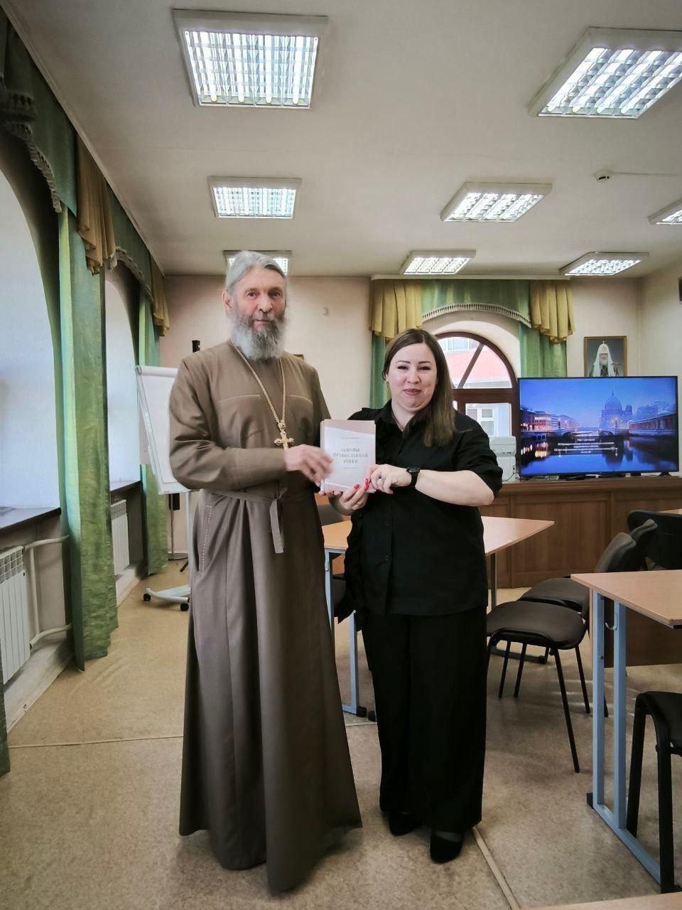 Слушателям курсов были вручены изданные в рамках проекта «Центр духовно-нравственного просвещения и культуры «Истоки» 2.0 учебные пособия по истории Православия в Забайкалье, Православной этике, литературе и религиях на карте Забайкалья. Проект «Центр духовно-нравственного просвещения и культуры «Истоки» 2.0″ реализован РО-ДПОО «Центр подготовки церковных специалистов Читинской епархии на средства гранта Президента РФ, предоставленного Фондом президентских грантов.