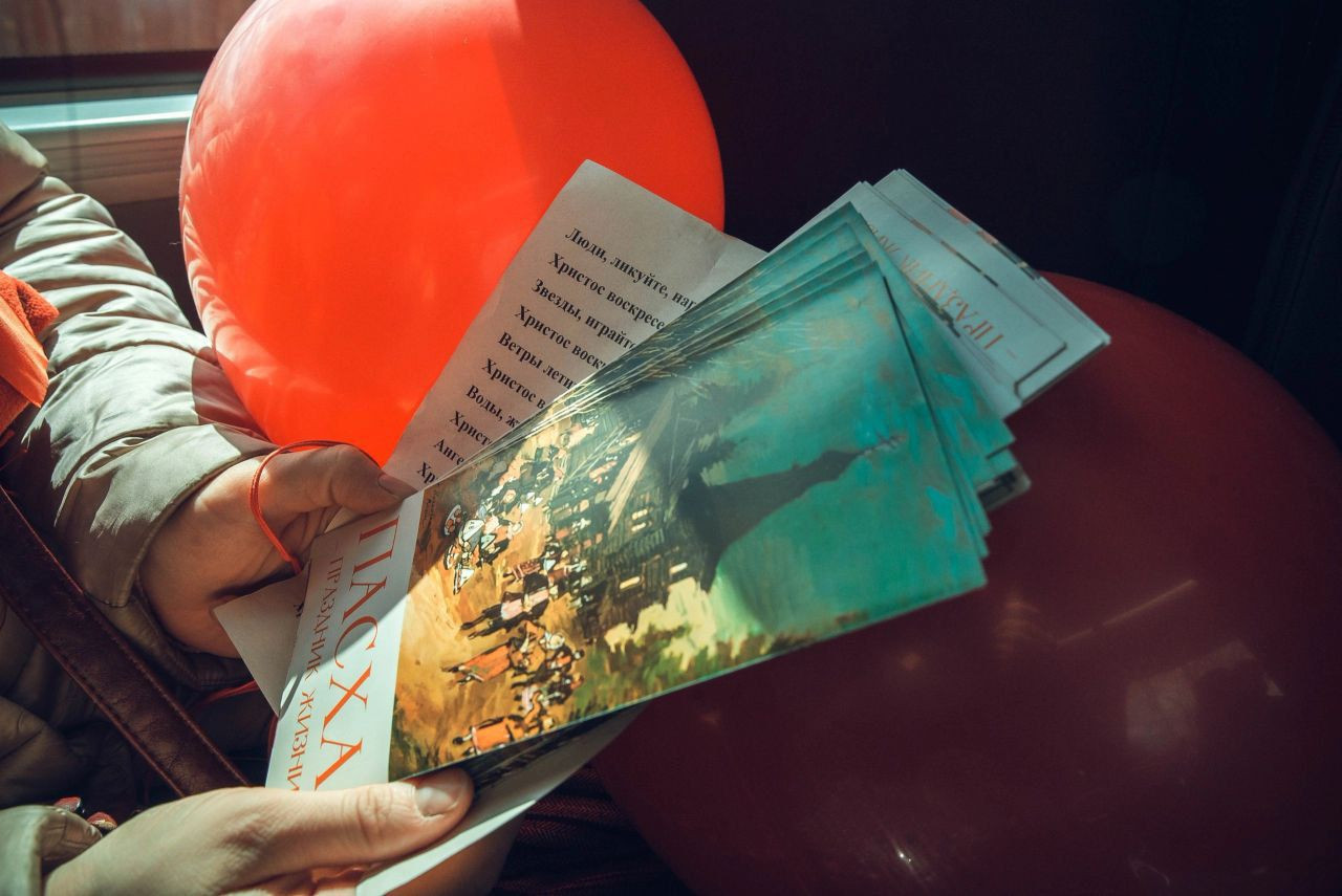 На остановках из автобуса выходили взрослые и дети, вручали горожанам подарки, шарики, буклеты, сладости, крашенки и пели пасхальные песнопения.