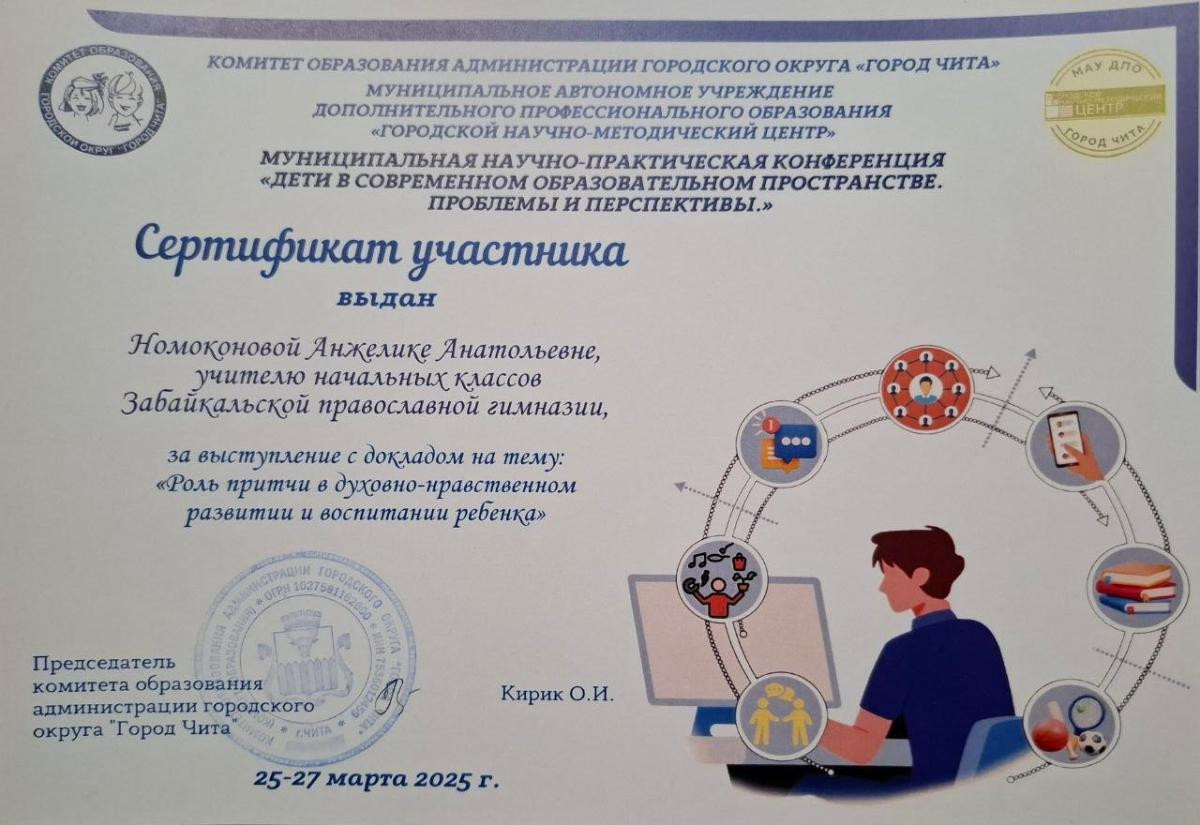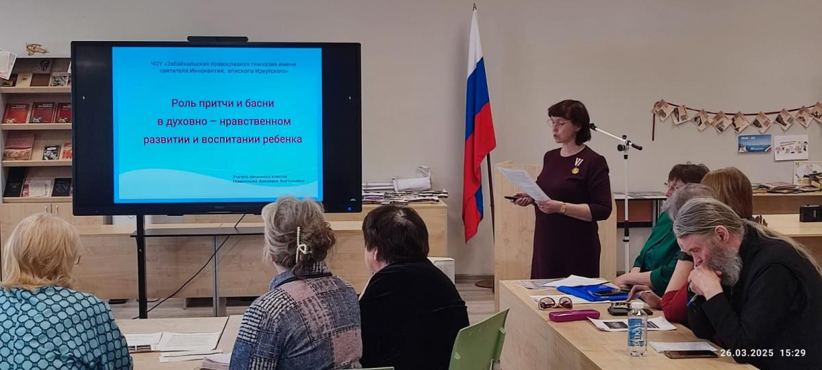 Также активное участие в работе круглого стола приняли преподаватели Забайкальской православной гимназии: Тылькевич С. Ю., учитель основ православной веры, химии и биологии, которая представила презентацию цифровой платформы «Клевер Лаборатория»; учитель начальных классов Номоконова А. А., с темой выступления: «Роль притчи в духовно-нравственном развитии и воспитании ребенка».