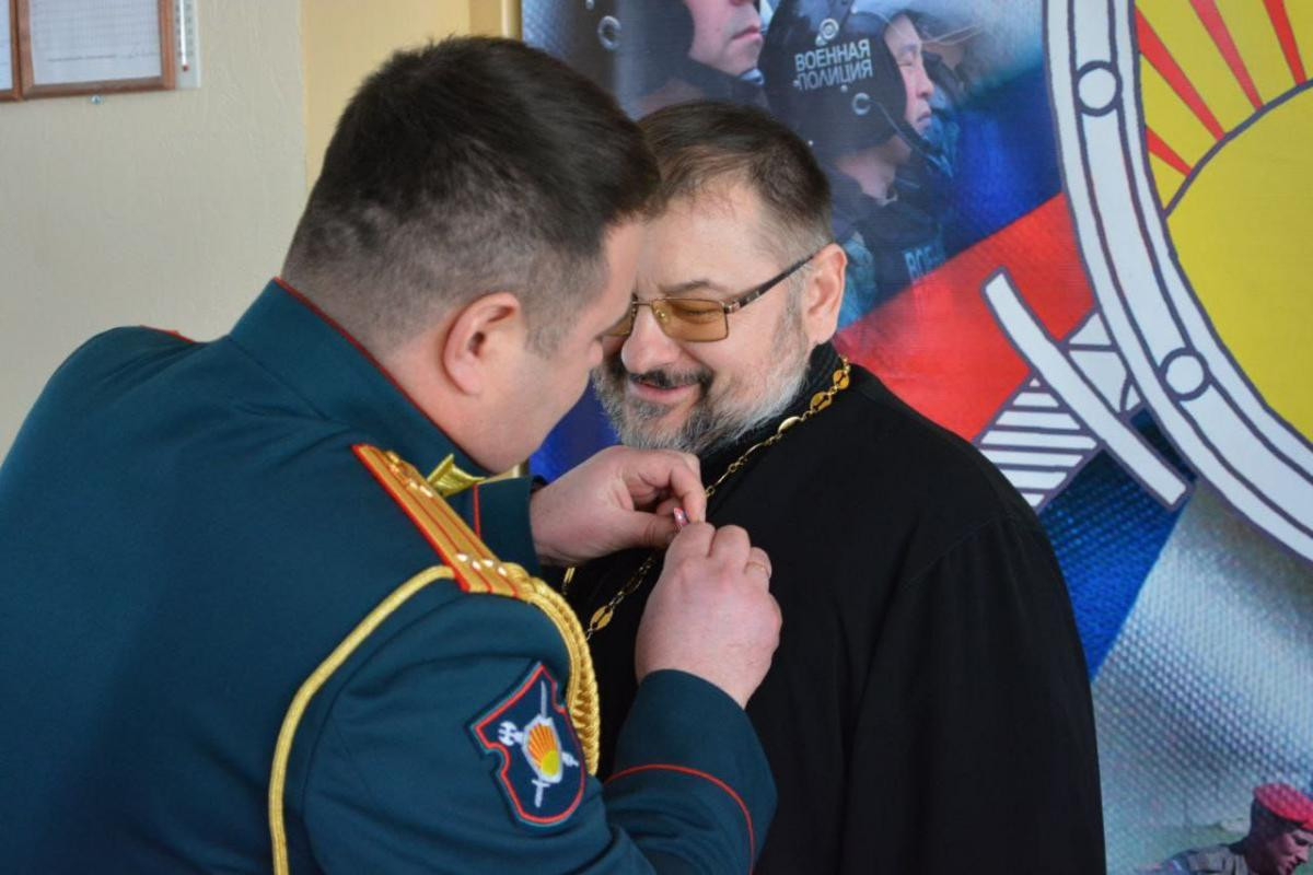 В благодарность за поддержку и духовное окормление военнослужащих командир батальона подполковник Саврин Сергей Сергеевич вручил протоиерею Михаилу Андрусю памятную медаль «Защитнику Отечества».