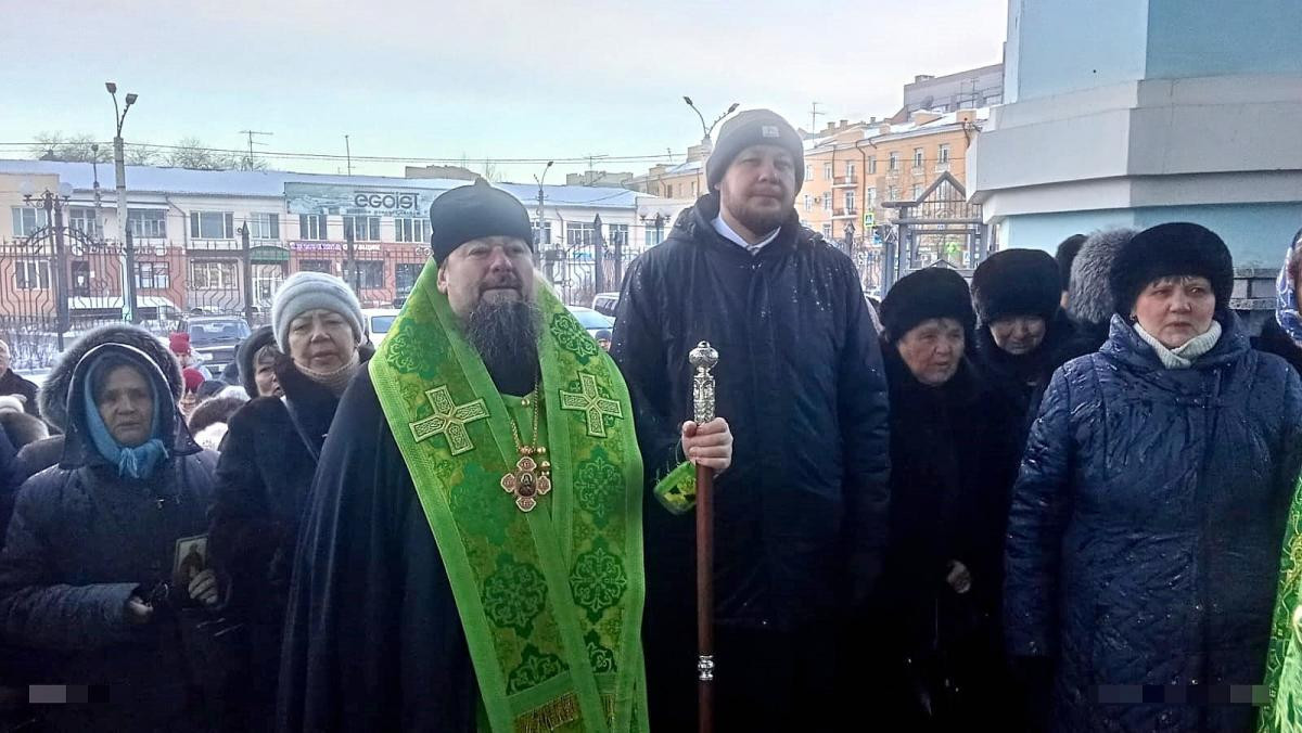 В этот день глава Забайкальской митрополии благословил бригаду иконописцев на дальнейшую роспись Казанского кафедрального собора в Чите и окропил всех святой водой.