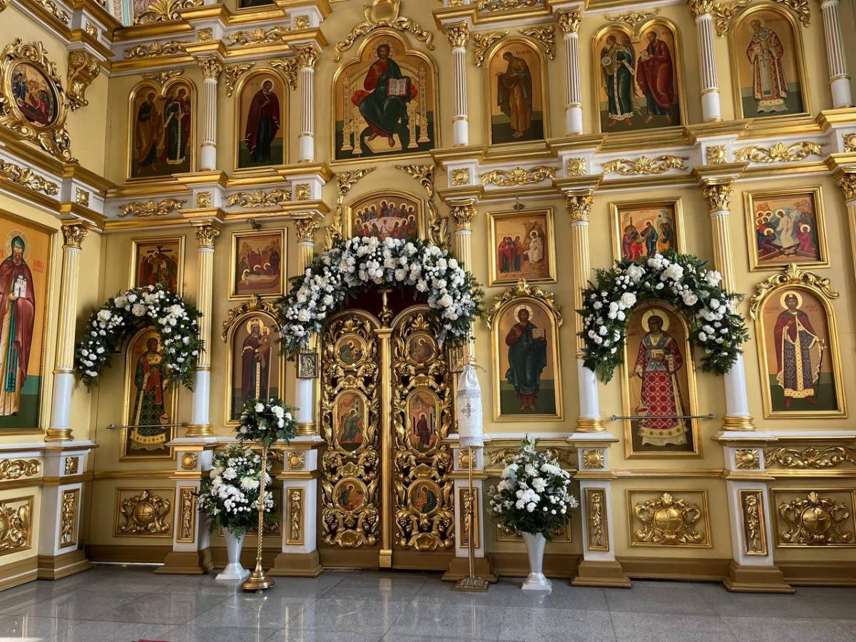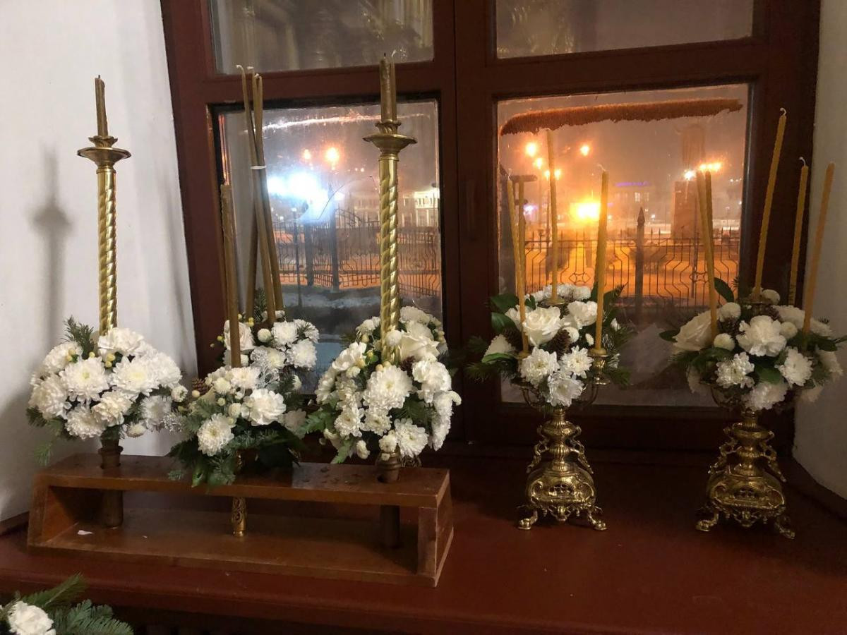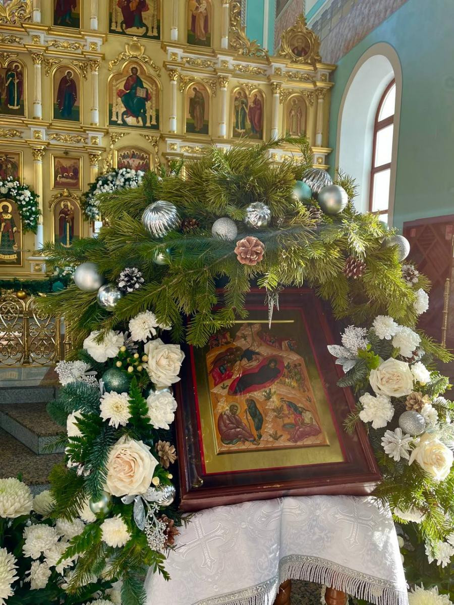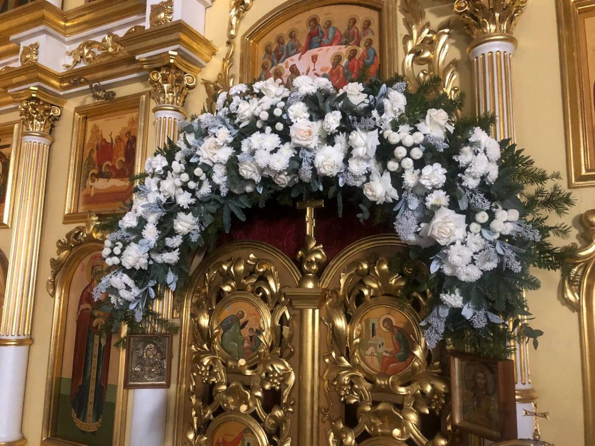 Центральное место в украшении занял предел святого благоверного великого князя Александра Невского. Особое внимание было уделено иконе Рождества Христова. Нежные сосновые ветви, украшенные серебристыми шарами, сочетались с композициями из шишек и белых цветов. Также флористическими элементами был облагорожен иконостас и богослужебная утварь к праздничным богослужениям.